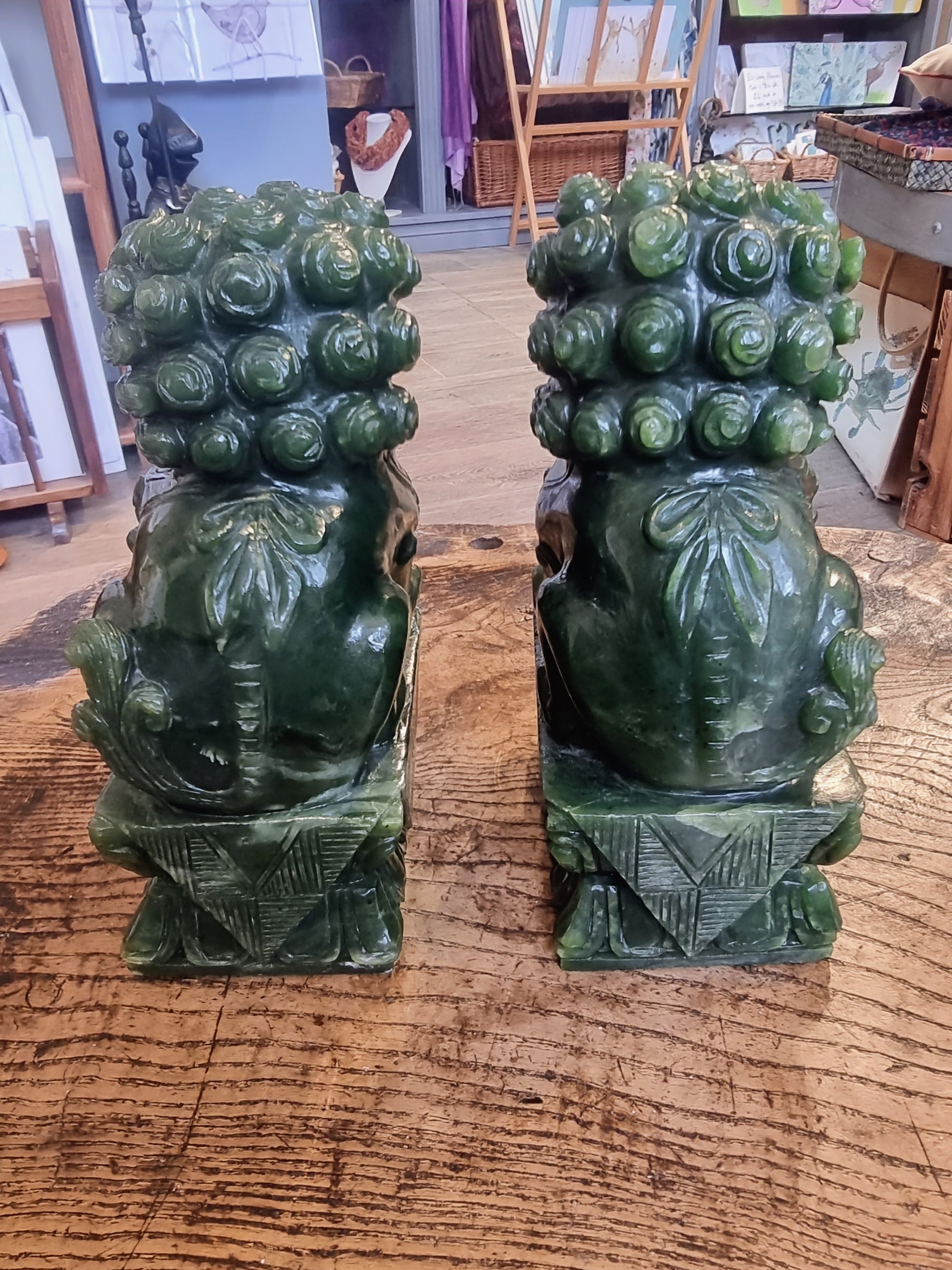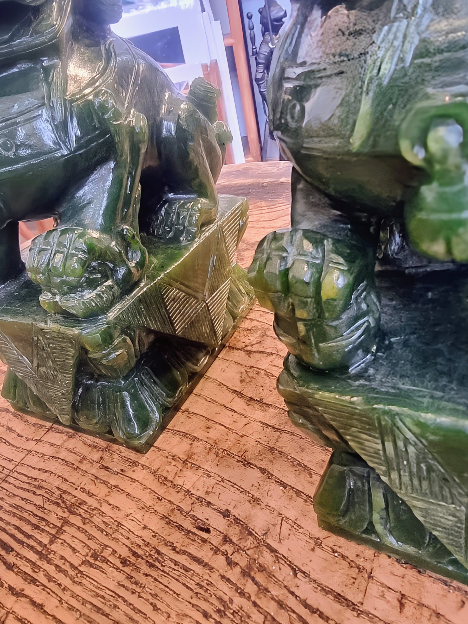 The Sentinels A matched, non-orphan pair of guardian lions (Shishi). These "Vintage Export Era" pieces feature a Male with the imperial globe and a Female with her cub—representing the perfect balance of Yin and Yang.